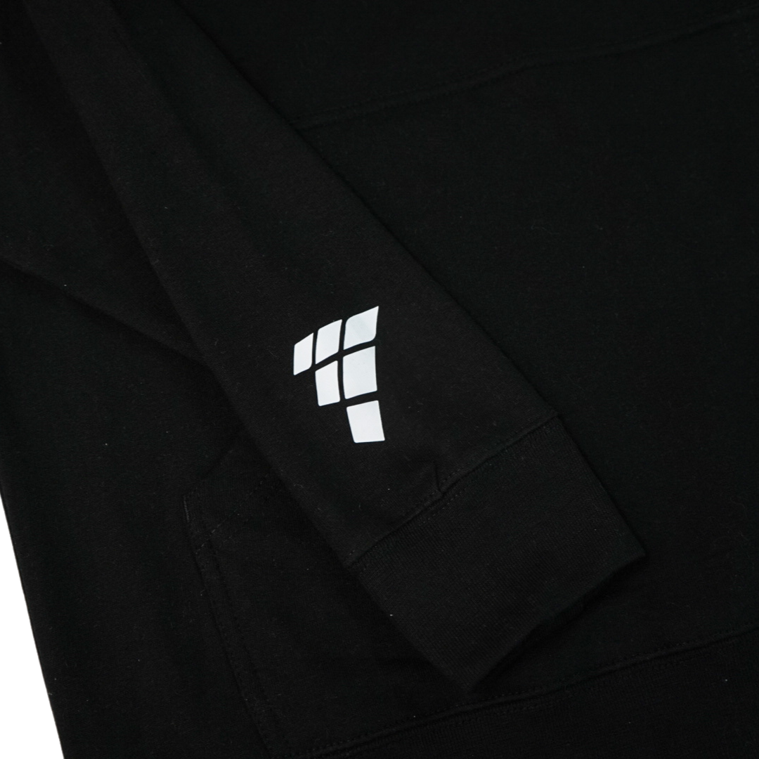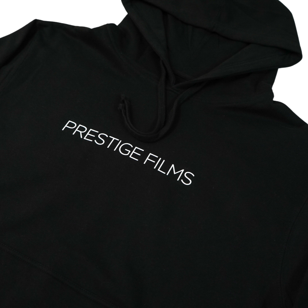 Stay cozy in our classic Prestige Films hoodie. This black pullover features clean white branding, a kangaroo pocket, and drawstring hood – perfect for both work and casual wear.