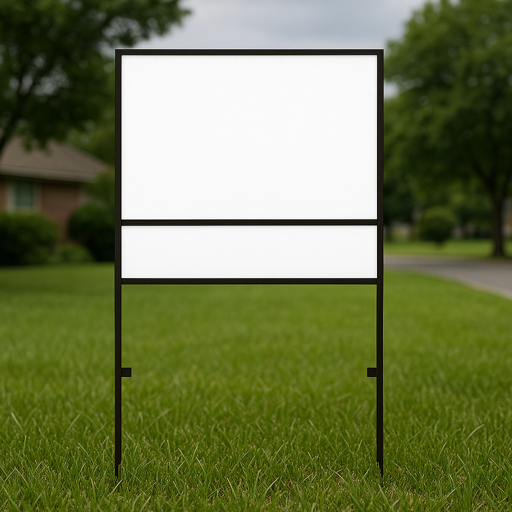 Elevate your outdoor messaging with our all-in-one Coroplast Yard Sign system. Featuring a rigid, weather-resistant Coroplast panel, a powder-coated steel frame, and an integrated 6″ × 24″ rider—everything you need for professional, eye-catching lawn displays.