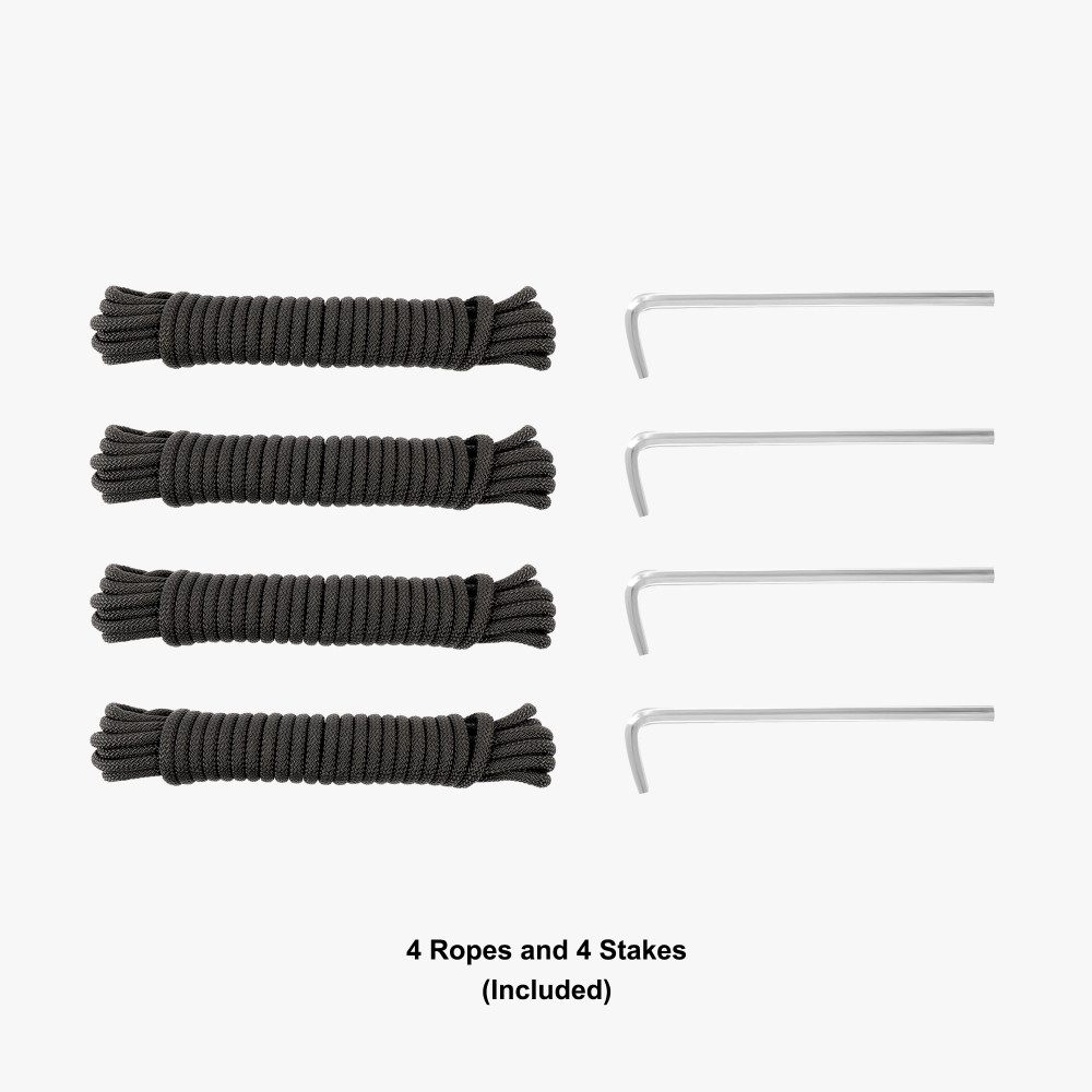 Includes heavy-duty ropes, rugged stakes, and a reinforced carry bag—everything you need to hit the road and be event-ready.